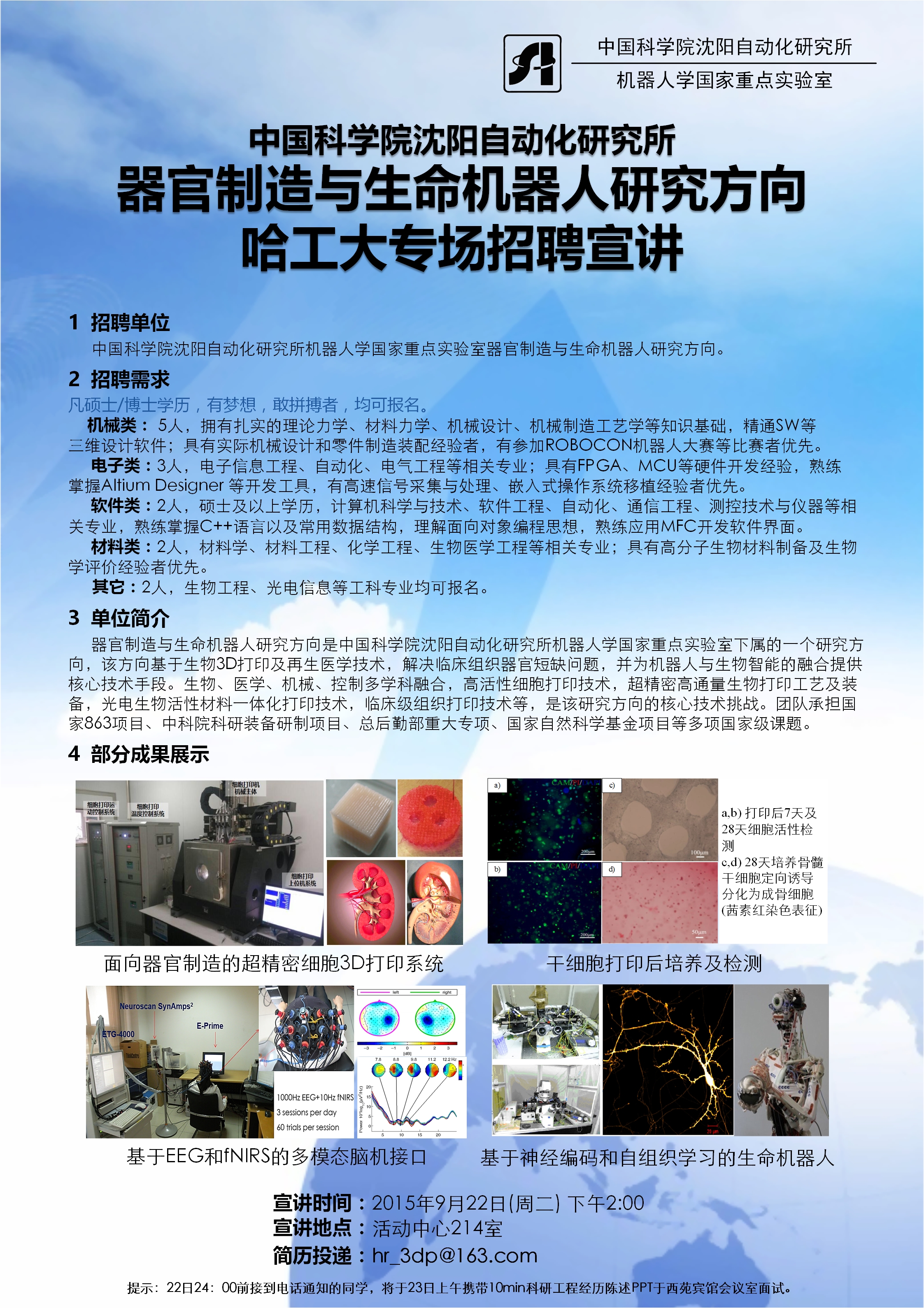 中科院沈阳自动化所9月22日周二14:00在活动中心214宣讲,其中器官制造与生命机器人研究方向课题组招硕士、博士,包括机械类、电子类、软件类、材料类、生物类等工科专业。简历投递[email protected]。详见附件。