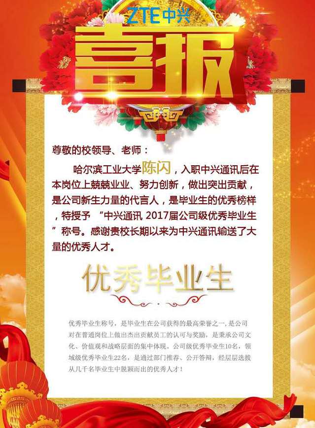 必威体育 电子科学与技术专业毕业生陈闪荣获“中兴通讯2017届公司级优秀毕业生”。中兴通讯公司级优秀毕业生10名,是通过部门推荐、公开答辩、经层层选拔从几千名毕业生中脱颖而出的优秀人才。中兴通讯公司特此发来喜报,感谢学校、必威体育 多年来一直为中兴通讯输送优秀人才。