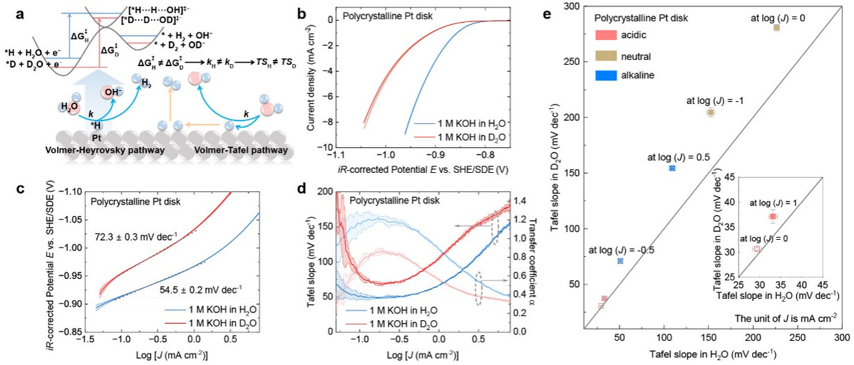 氢能被视为实现碳中和的关键能源载体,而电催化水分解制氢技术的核心瓶颈在于反应效率低。长期以来,研究人员难以直接观察水分解过程中质子(氢离子)在电极-溶液界面的转移行为,严重制约了催化剂结构设计的进一步优化。针对这一科学问题,研究团队通过将反应介质中的氢原子(H)替换为质量增加一倍的稳定同位素氘(D),利用同位素零点能的差异引起的催化性能变化研究质子传递的动力学行为。这种同位素替换导致O-H/O-D键振动频率显著降低,使得质子穿越电极-溶液界面的能垒变化可被精确捕获。